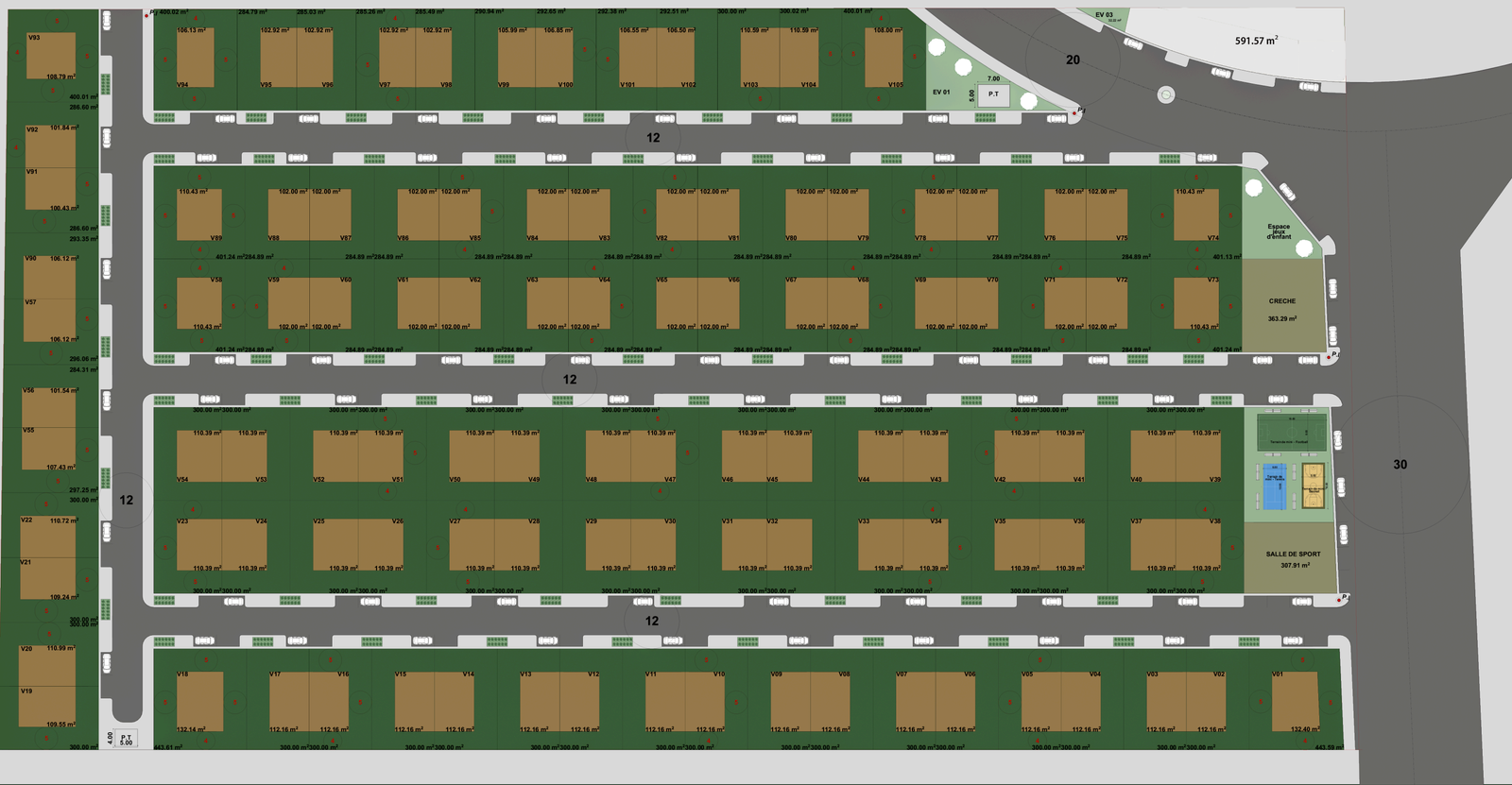 Le lotissement comprend des voies de circulation bien aménagées, ainsi que divers équipements tels qu’une crèche, une salle de sport, des terrains multisports et de vastes espaces verts, créant un environnement idéal pour une vie équilibrée et dynamique.